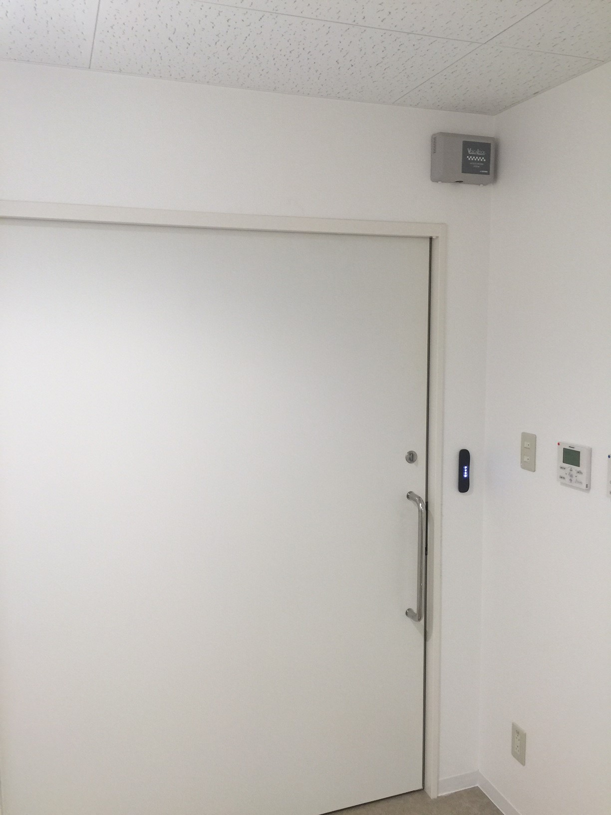 室内側からの写真です。退室するときは解錠スイッチを押すと電磁石錠が解錠します。